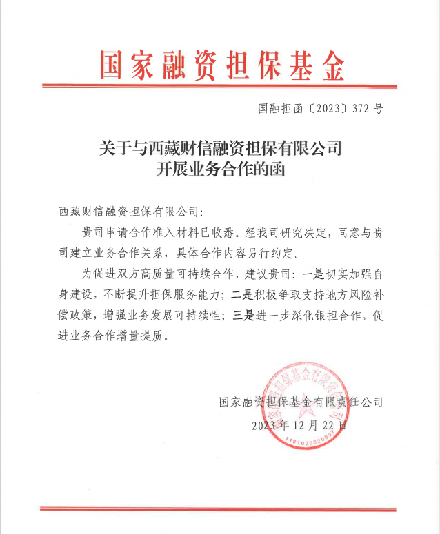 2023年12月22日,財信擔(dān)保收到國家融資擔(dān)?;鹩邢挢?zé)任公司《關(guān)于與西藏財信融資擔(dān)保有限公司開展業(yè)務(wù)合作的函》(國融擔(dān)函〔2023〕372號),標(biāo)志著財信擔(dān)保正式加入國家融資擔(dān)保體系,成為全區(qū)唯一一家與國融擔(dān)“總對總”合作的政府性融資擔(dān)保公司,也標(biāo)志著“國家融資擔(dān)?;?省級再擔(dān)保機構(gòu)-地方融資擔(dān)保機構(gòu)”三級風(fēng)險分擔(dān)機制的正式落地實施。財信擔(dān)保與國融擔(dān)建立全面合作關(guān)系,既是自治區(qū)黨委政府、區(qū)金融監(jiān)管局、區(qū)財政廳和投資公司黨委關(guān)心支持、積極推動的結(jié)果,更是我區(qū)政府性融資擔(dān)保行業(yè)高質(zhì)量發(fā)展具有里程碑意義的大事、喜事。